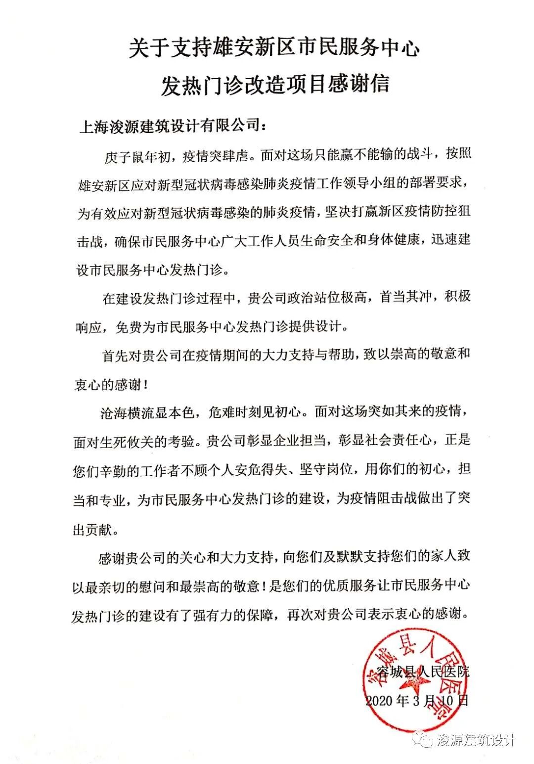 浚源首当其冲,即时响应,河北分院与雄安分公司的同事们连夜赶工、齐心协力,无偿为雄安新区市民服务中心发热门诊项目提供设计服务,以实际行动支持抗疫工作。